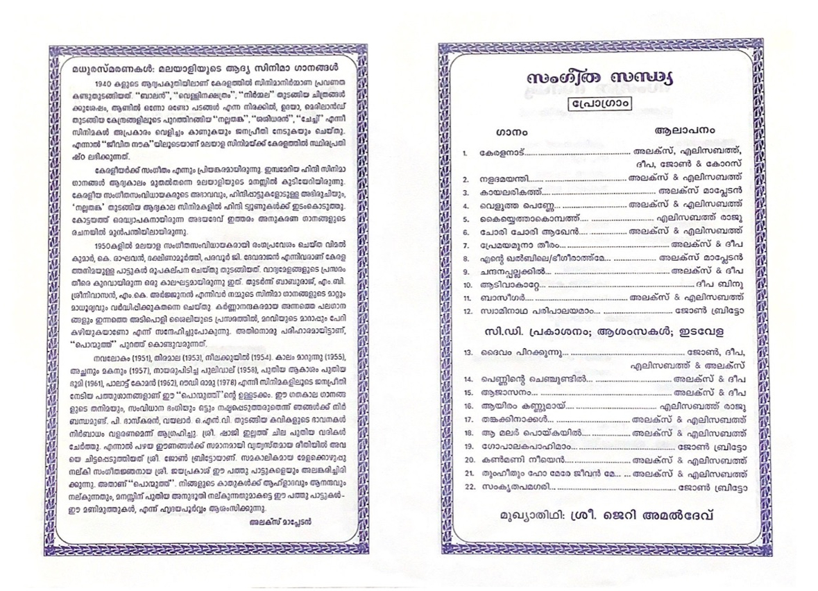 - Sungeeth Sandhya – Held at Dr. Alex Chettiath Memorial Hall, Kidangoor, India on Dec. 14, 2008. Chief guest, Cine Music Direction Jerry Amaldev.