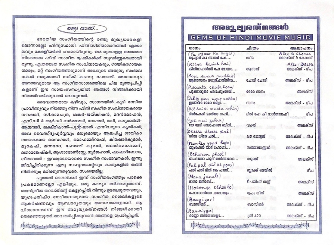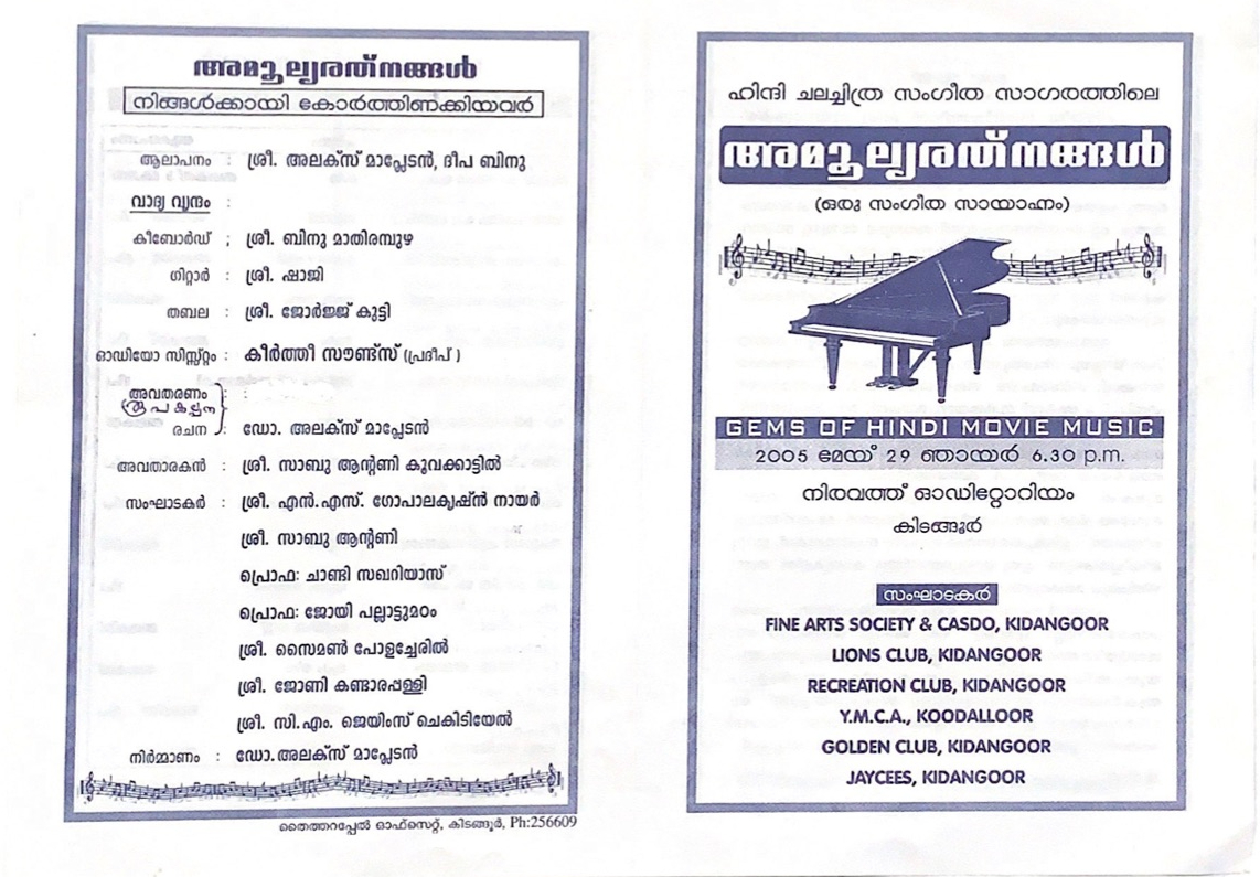 - Amoolya Ratnangal (Gems of Hindi movie music) – On May 29, 2005, Niravath Auditorium, Kindangoor, India