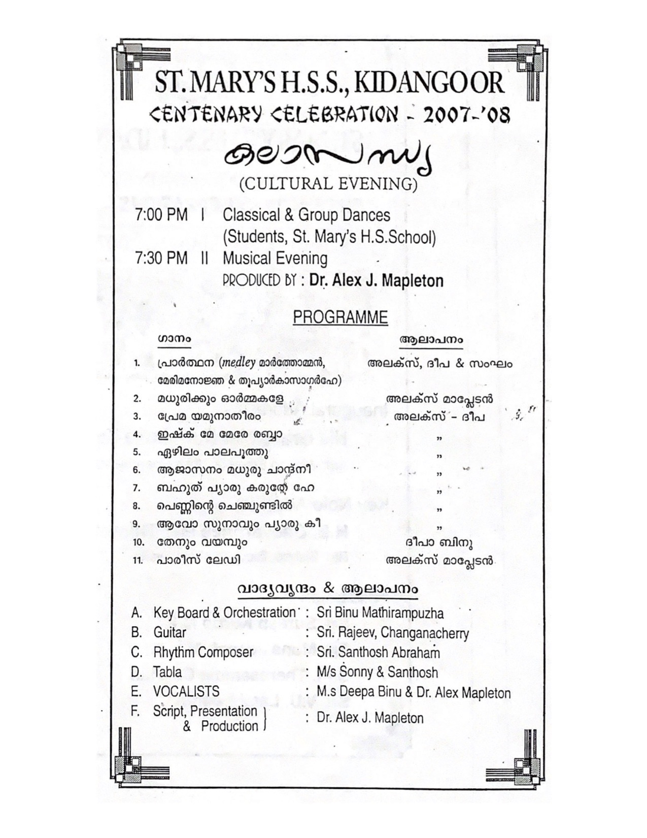 - Kala Sandhya – In connection with the Centenary Celebrations of St. Mary’s HHS Kidangoor, India, a musical evening was held on Jan. 20, 2007.