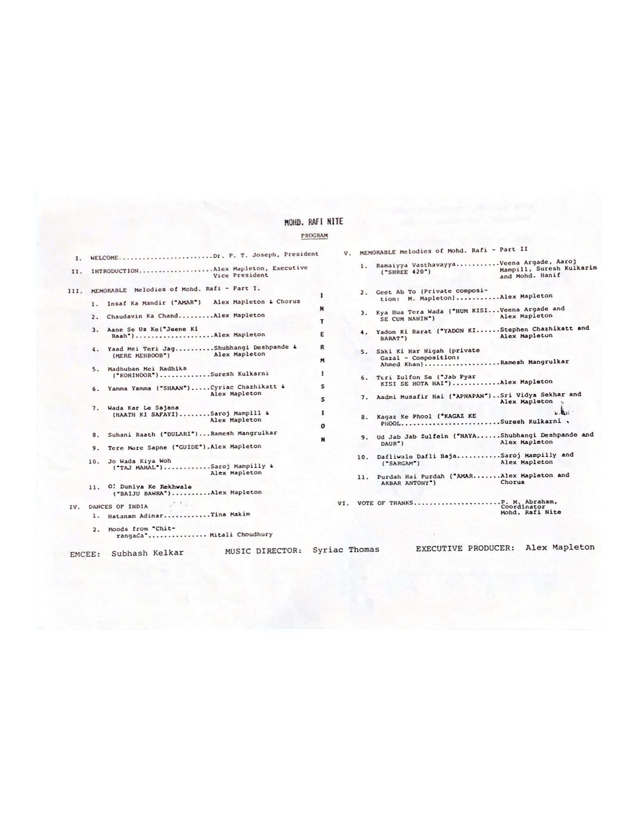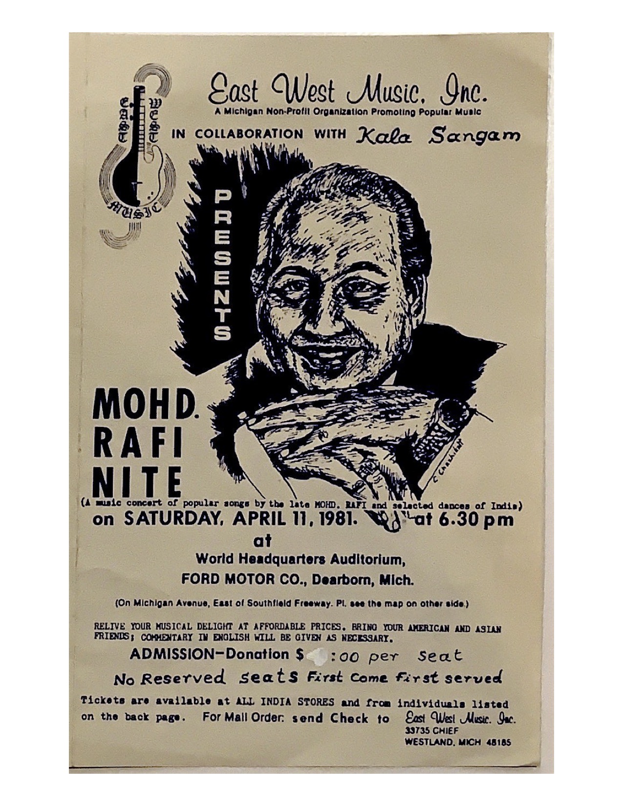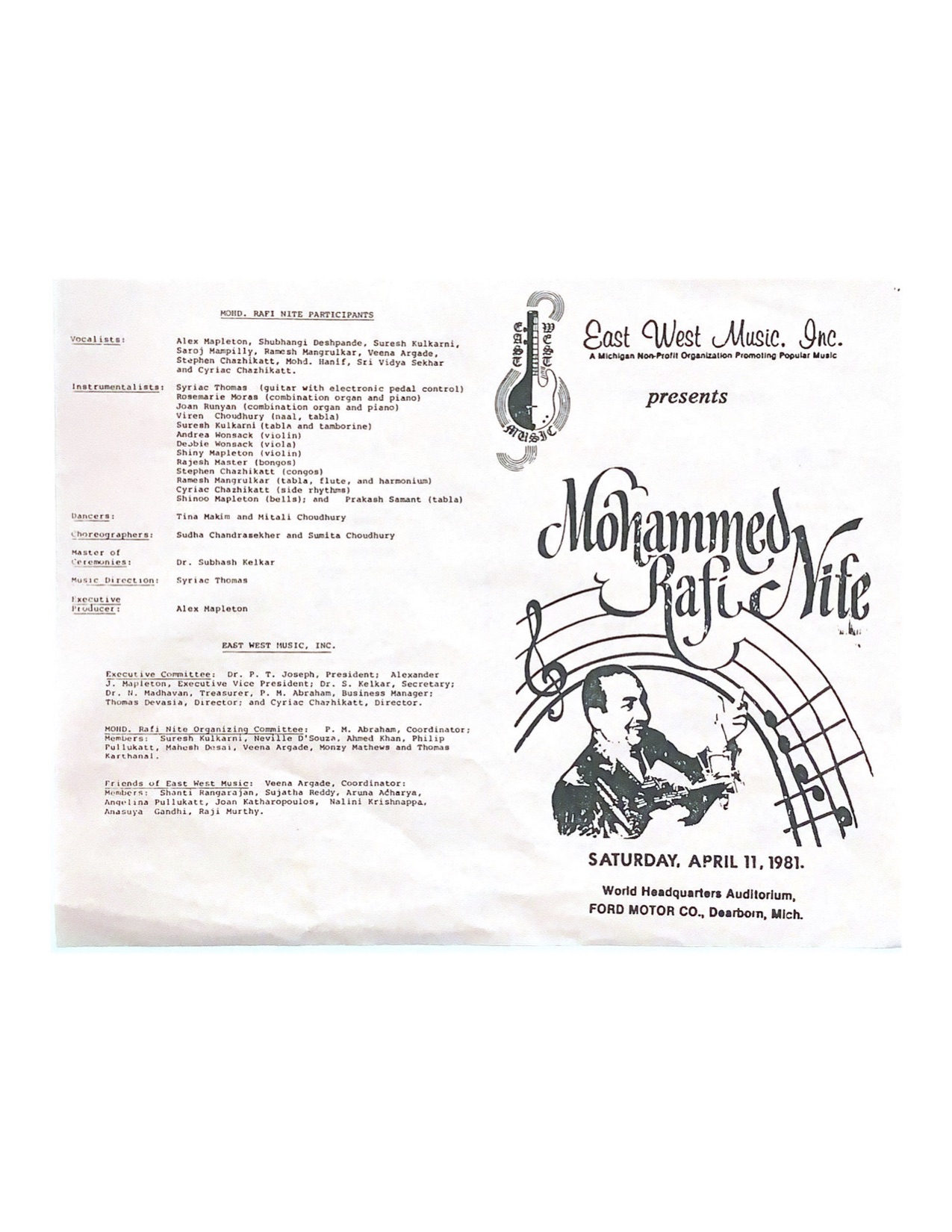 - Mohammed Rafi Nite – On April 11, 1981, to commemorate the musical contributions of India’s all time great singer Mohammed Rafi, a concert was held in Detroit. 22 immortal songs of Rafi Saab were presented. The legendary singer had passed away the previous year. Reportedly, this memorial musical evening was the first in North America, perhaps anywhere in the world.
