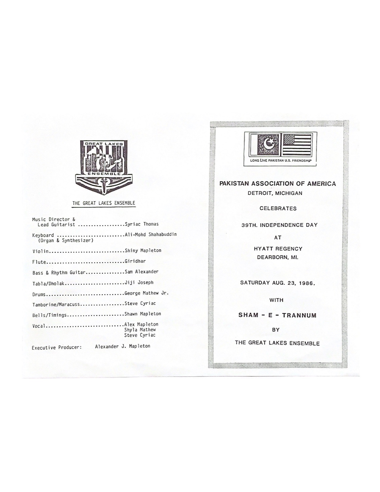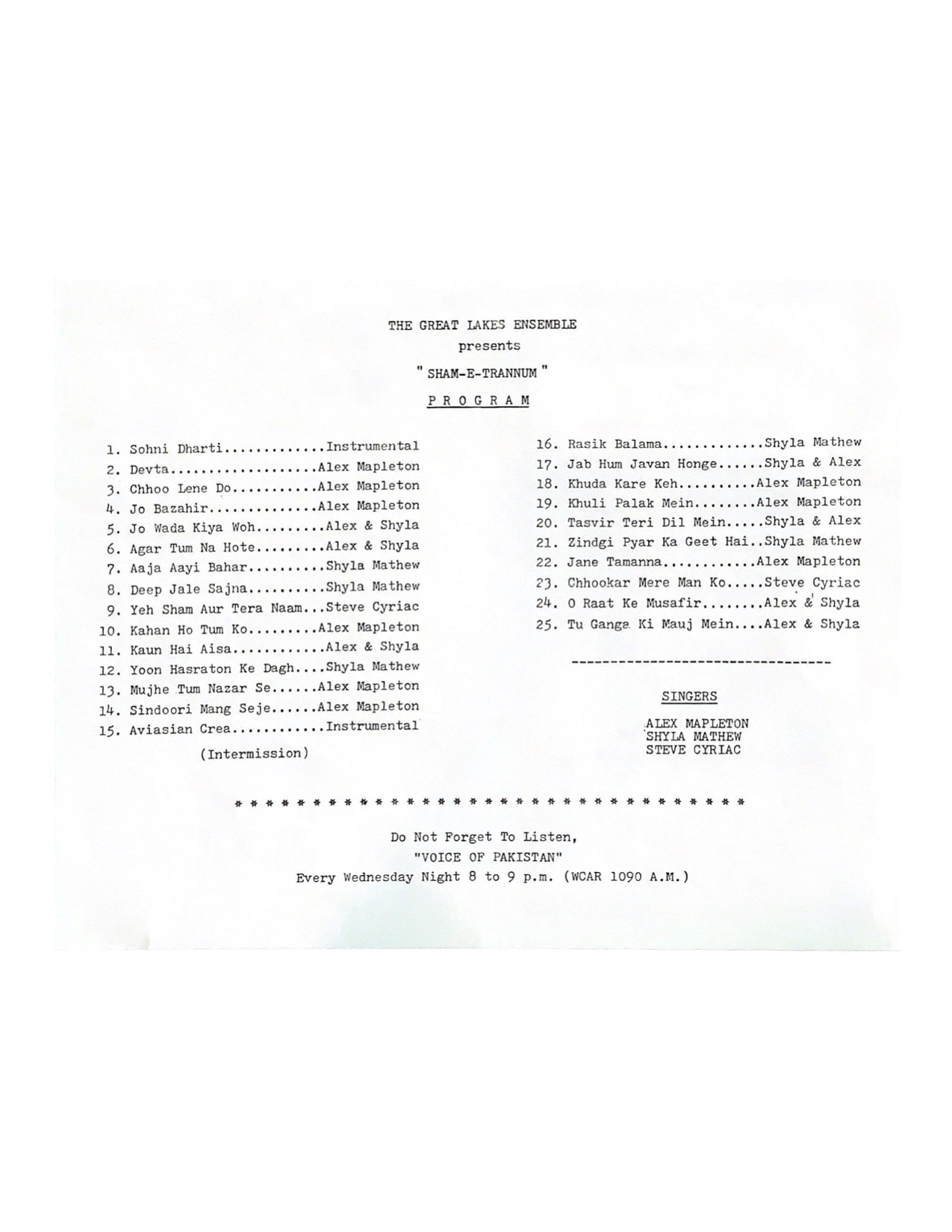 - Sham-A-Trannum – A concert sponsored by the Pakistan Association of America on August 23, 1986 in Detroit with songs selected from both Indian and Pakistan.